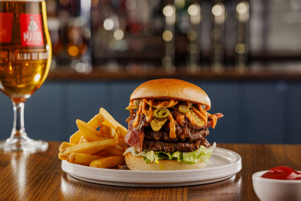 Chilli nacho, two 3oz beef patties topped with chilli con carne, cheesy nacho sauce, bacon, jalapeños and tortilla chips | 12.99 1337 kcals